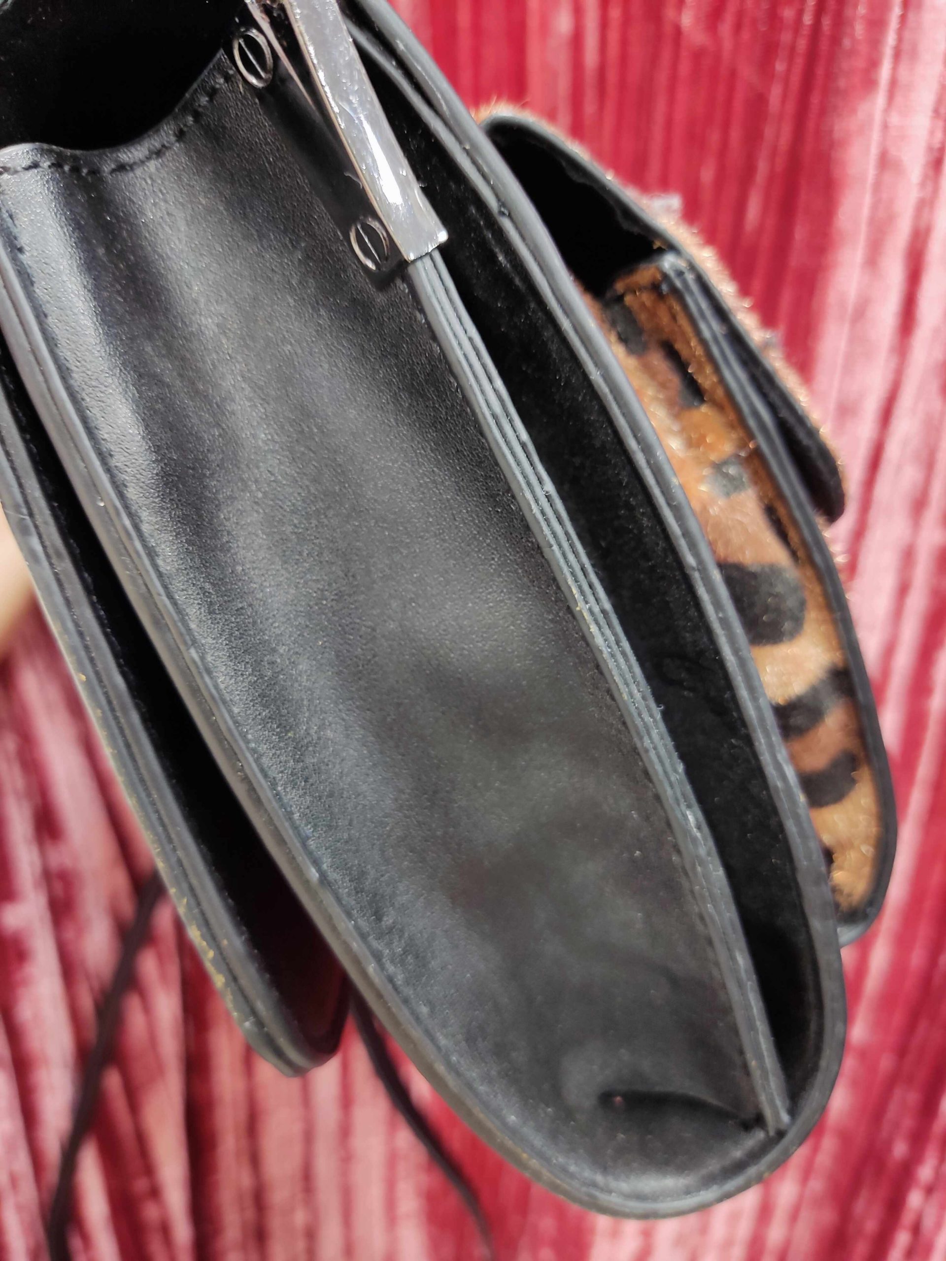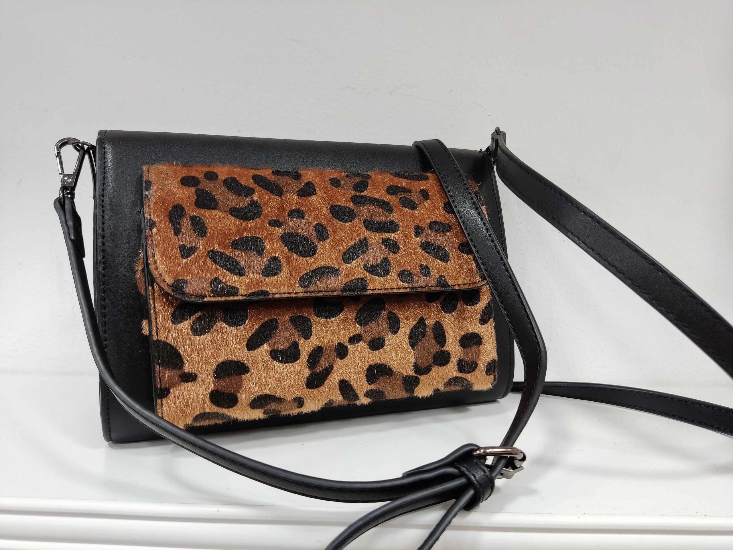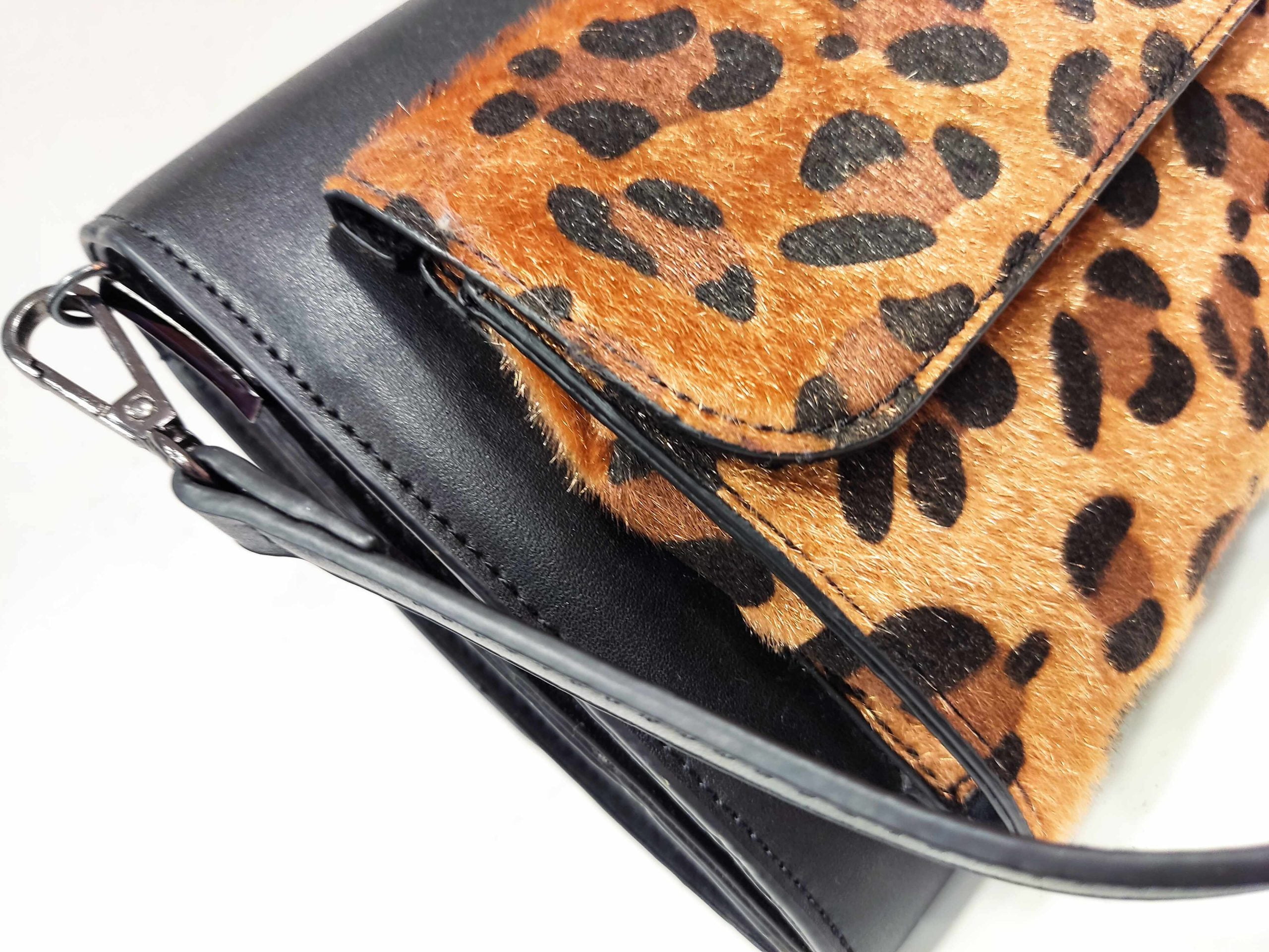 Τσαντάκι χιαστί-φάκελος με δύο εξωτερικά τσεπάκια κι animal print επιφάνεια στη μία όψη
